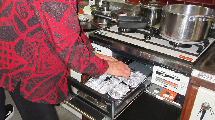 グリルで魚のホイル焼きをするデイサービスのご利用者(朝日新聞社撮影)